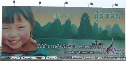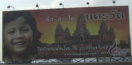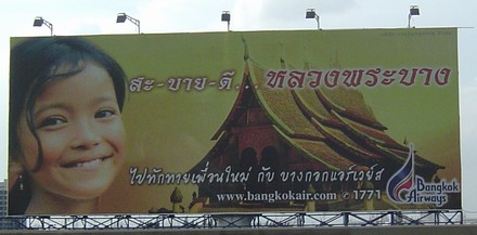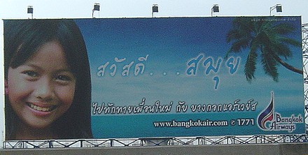 そんな中で、秀逸だなと思えたのがバンコクエアの連続看板です。同社は1968年にサハコンエアとして創設され、企業(油田や天然ガス)用のチャーター便関連で基礎を築いた会社です。1989年、サムイ島に私設の空港を開設してからブレイクし、1996年にはスコータイ、2003年にはトラートにも私設の空港を開設しました。また、1997年からのシンガポールやカンボジア、2001年からの中国各地への近距離国際線はもとより、チャーター便の実績を生かして2005年末には広島、2006年末には福岡にも国際定期便ルートを広げてきました。現在は、マレーシア(クアラ、ランカウィ)、ミャンマー(パガン、マンダレー)、インドネシア(メダン)への路線開設を目指して、着々と準備中です。