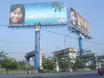 バンコクの街には、至る所に様々な広告看板が建てられています。中でも、様々なお客が見るので視覚的効果が高いからでしょう、(旧空港の)ドンムアンから市街へ至る高速道路の脇には実にいろいろな広告看板が建てられています。